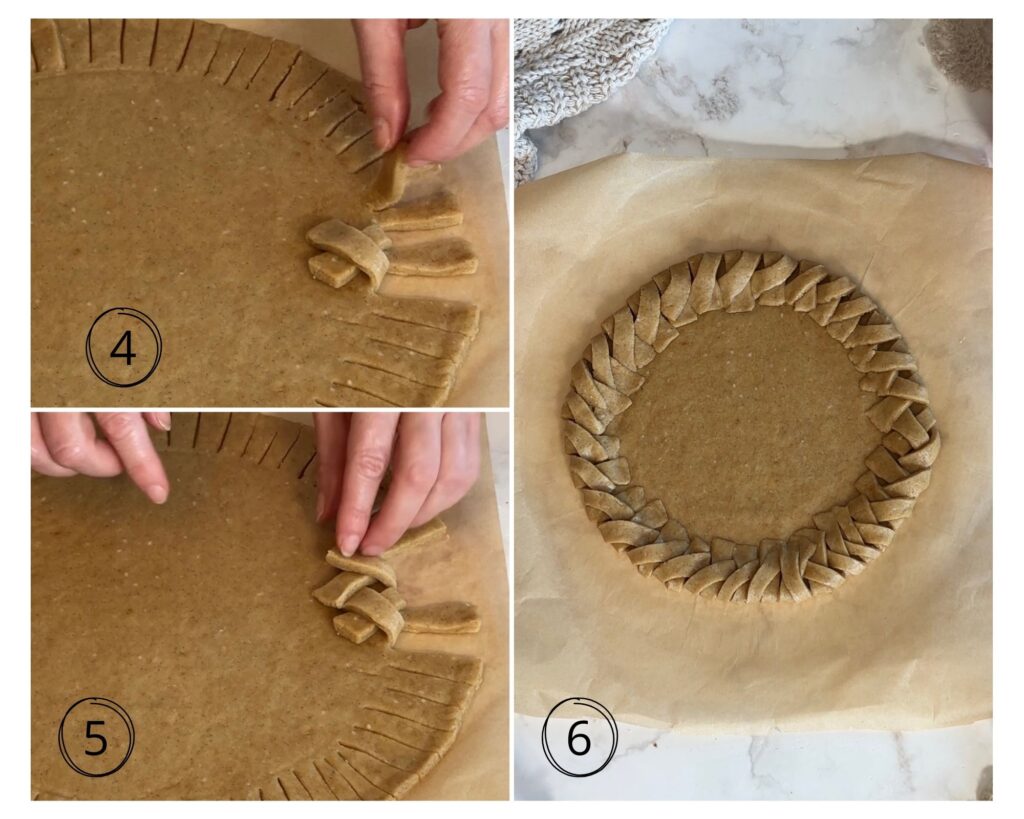 Poggia poi un piatto da 23 cm di diametro al centro: lascerà un segno di riferimento per tagliare le strisce. Ritaglia tante strisce il più possibile regolari poi inizia a intrecciarle una sopra l’altra a due a due.